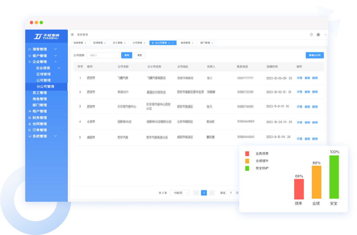 针对汽车销售、租赁、服务行业量身打造,聚焦客户业绩提升;多区域多门店体系,一站式统一管理。